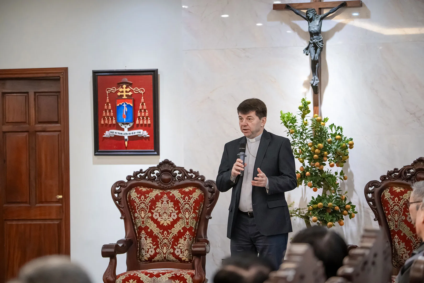 Vào lúc 11g15, Đức TGM Marek Zalewski – Đại diện Tòa Thánh thường trú tại Việt Nam đến gặp gỡ và chia sẻ với quý Đức cha. Sau đó, quý đấng bậc cùng dự bữa tiệc ấm áp tình huynh đệ.