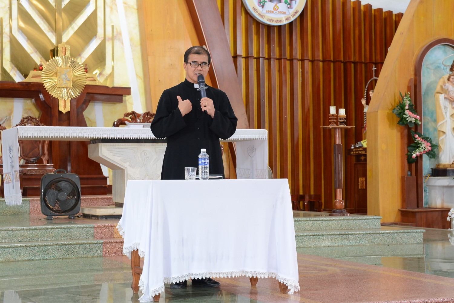 Tiếp đó, anh chị em bước vào những giây phút lắng đọng trong giờ huấn đức do cha Quản hạt Giuse Đỗ Minh Hiển chia sẻ. Trong bài giảng, cha nhấn mạnh ba phương diện căn bản trong đời sống người giáo lý viên.
