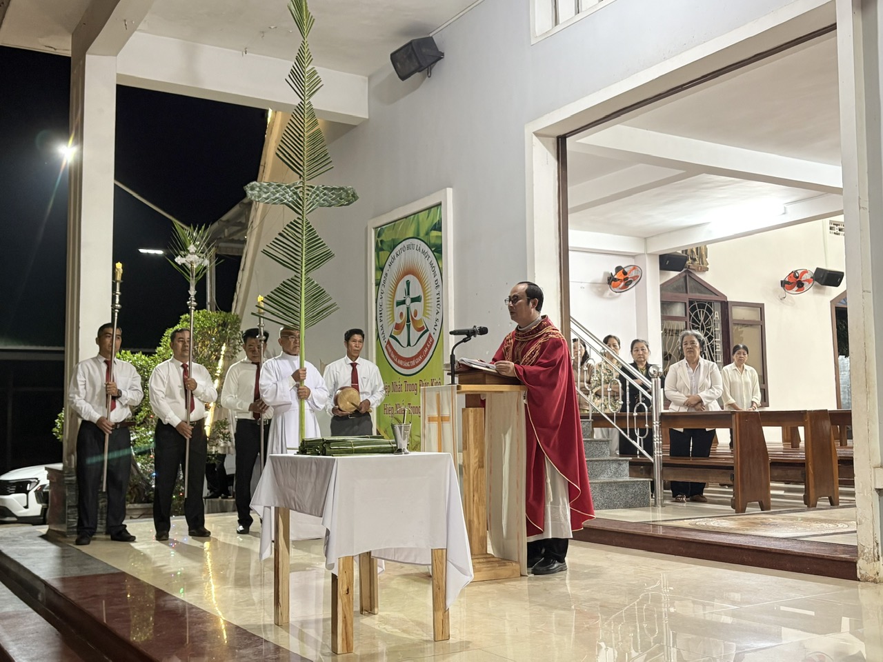Trước Thánh lễ, Cha chủ tế cùng cộng đoàn đã cử hành nghi thức làm phép lá tại khuôn viên nhà thờ. Sau đó, trong bầu khí trang nghiêm và sốt sắng, đoàn rước tiến vào thánh đường với những cành lá trên tay, hòa cùng ca nhập lễ, tưởng niệm biến cố Chúa Giêsu khải hoàn tiến vào thành Giêrusalem.