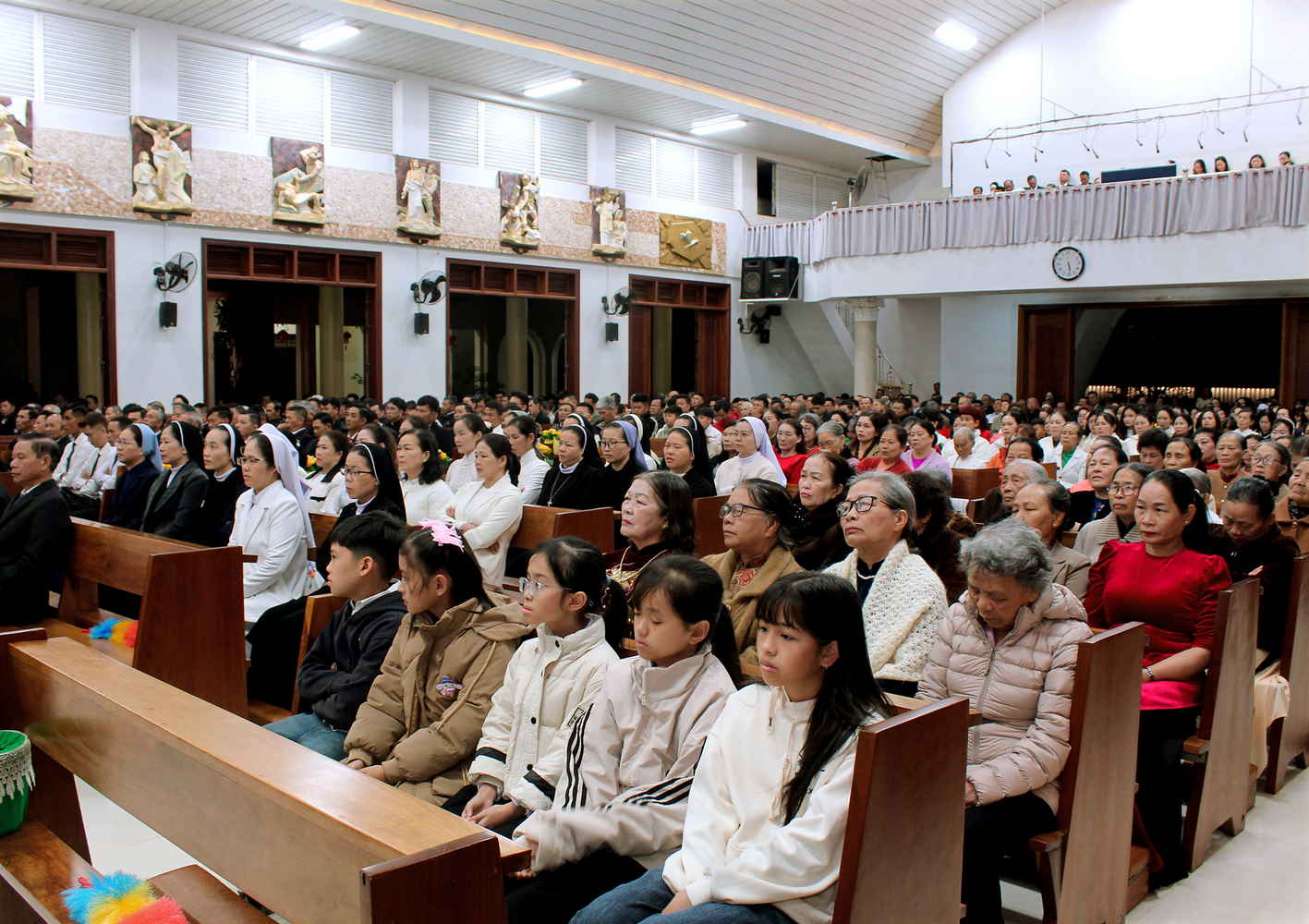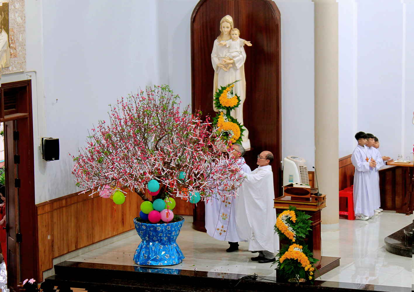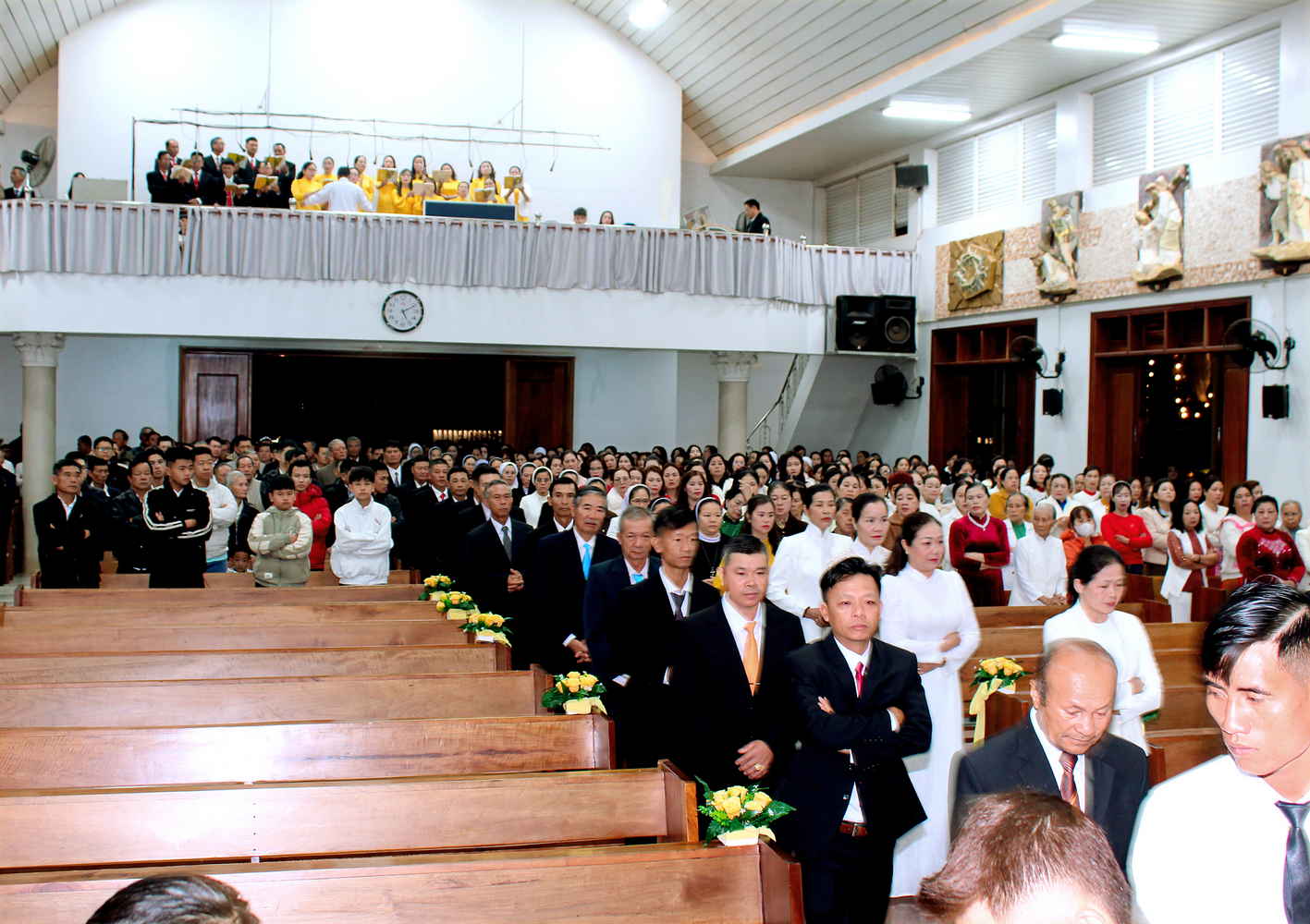 Ngay từ sớm, khuôn viên nhà thờ rực rỡ sắc xuân với cờ hoa, câu đối và những chậu mai vàng khoe sắc. Đông đảo giáo dân, trong trang phục truyền thống ngày Tết, quy tụ về Thánh đường với tâm tình cảm tạ vì muôn ơn lành Chúa đã ban trong năm qua.