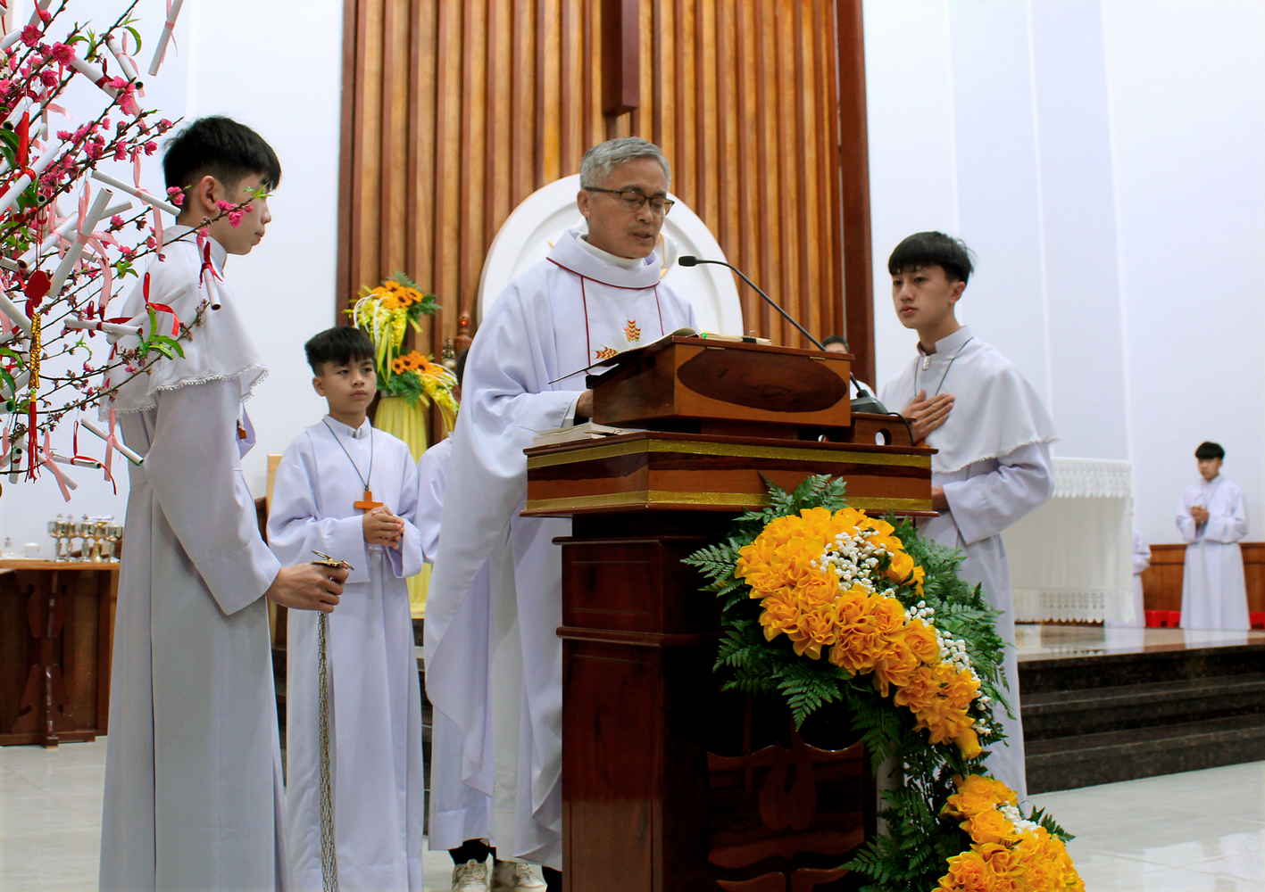 Sáng Mồng Một Tết Bính Ngọ, Cha Quản xứ Phaolô Lưu Văn Phan chủ tế Thánh lễ tạ ơn Thiên Chúa, cầu bình an cho năm mới.