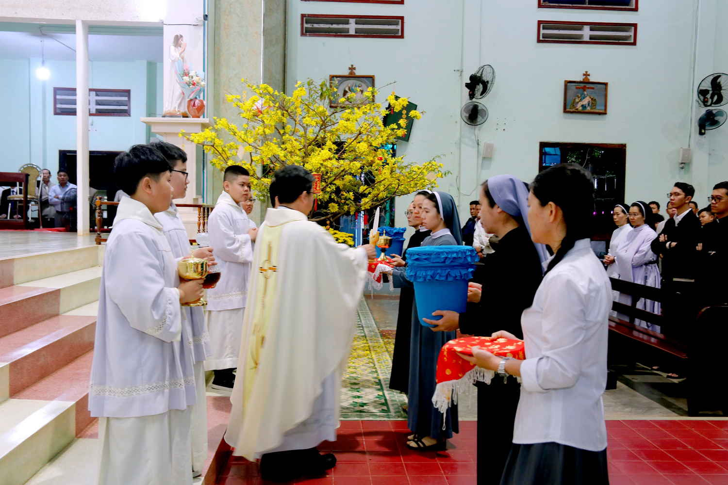 Mở đầu Thánh lễ, Cha Gioan Mai Tâm dâng lên Chúa những ước nguyện ý lễ, nguyện xin Ngài thánh hóa công việc của mỗi người trong Giáo xứ năm mới, giúp công ăn việc làm được thuận lợi và thăng tiến.