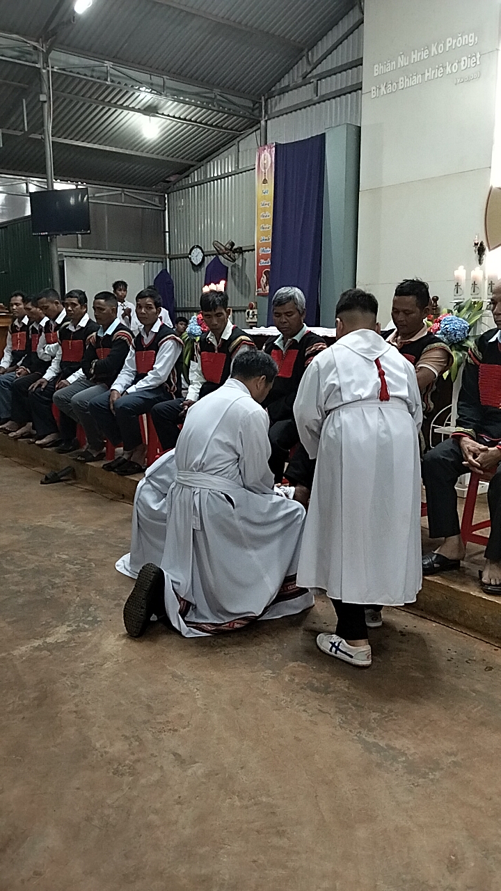Trong thánh lễ Tiệc Ly vào chiều thứ 5, tại Giáo xứ Ea Tul cha Quản xứ JB. Hoàng Nguyên Vũ đã tái hiện nghi thức rửa chân cho các môn đệ là quý ông đại diện các giáo buôn trong giáo xứ.