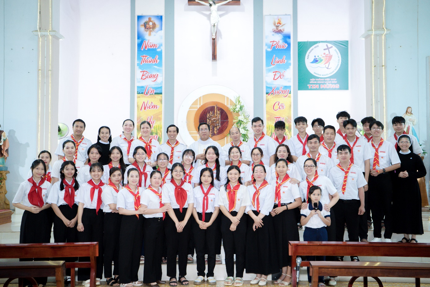 Sau lễ, các anh chị Giáo lý viên chụp ảnh lưu niệm cùng Cha xứ Antôn và quý Sơ.