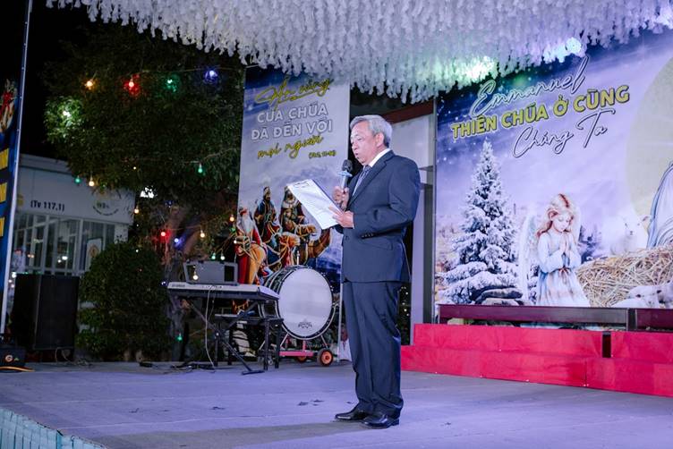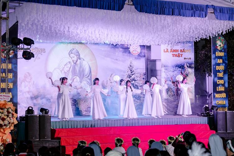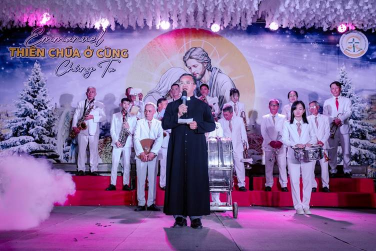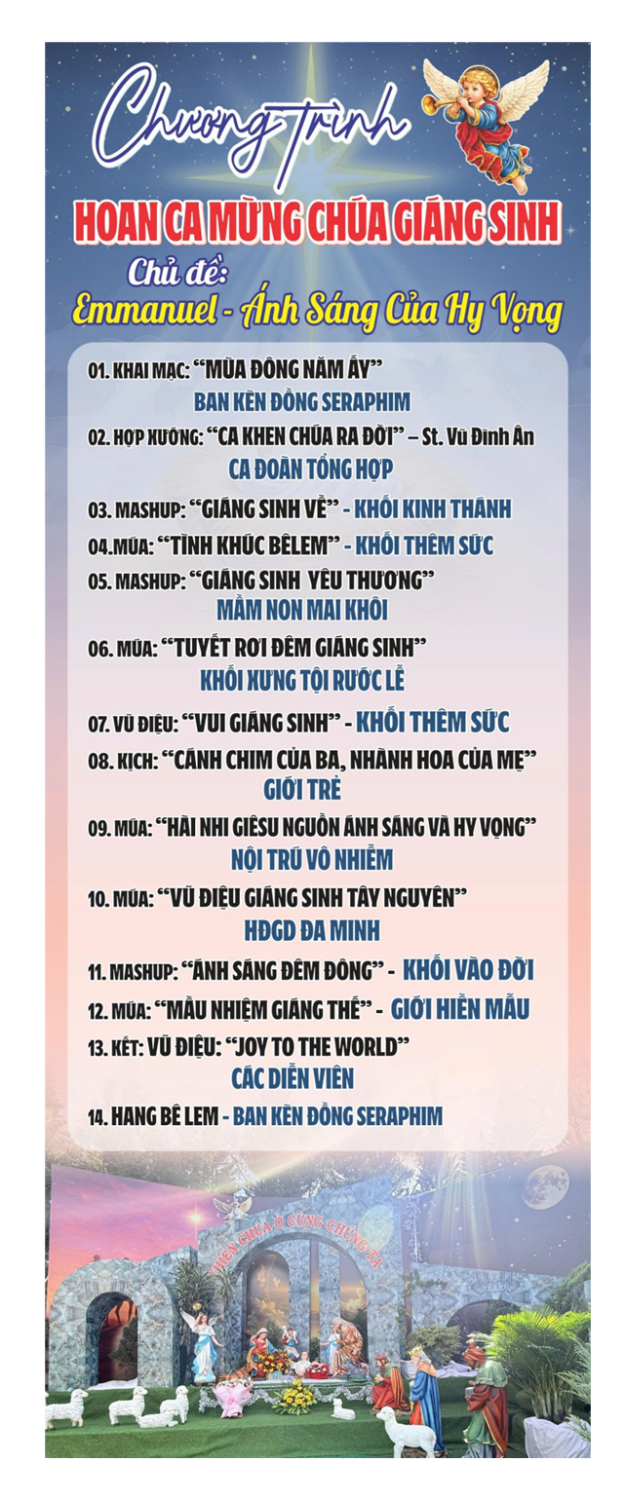 Kính thưa quý Cha và quý vị, mặc dù chúng con không phải là ca sĩ, nghệ sĩ chuyên nghiệp, chúng con cũng chẳng có những thiết bị hiện đại, tinh xảo để thực hiện; nhưng chúng con có trái tim nhiệt huyết, có tấm lòng, có tình yêu với tất cả sự cố gắng để trao gửi; vì thiết nghĩ trong thế giới âm thanh, có lẽ âm nhạc là loại hình dễ biểu lộ tình cảm, trạng thái lòng người cách phong phú hơn cả, như bao người đã nhận định: Thực phẩm nuôi phần xác, tiếng hát nuôi phần hồn. Với những tâm tình đó, giờ đây, chúng con kính giới thiệu đến quý Cha và quý vị chương trình hoan ca Giáng Sinh 2025 với chủ đề: “Emmanuel - Ánh sáng của hy vọng” qua 14 tiết mục do các đơn vị trong giáo xứ trình bày.