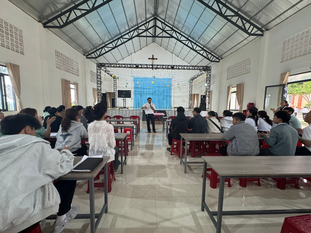 Trước khi chương trình khai giảng được bắt đầu, cha phó ban giáo lý Giáo hạt Phêrô Trần Văn Tuấn cùng quý anh chị Giáo lý viên đã có những giờ phút khởi động rất sôi nổi, tạo bầu khí vui tươi và ấm áp.