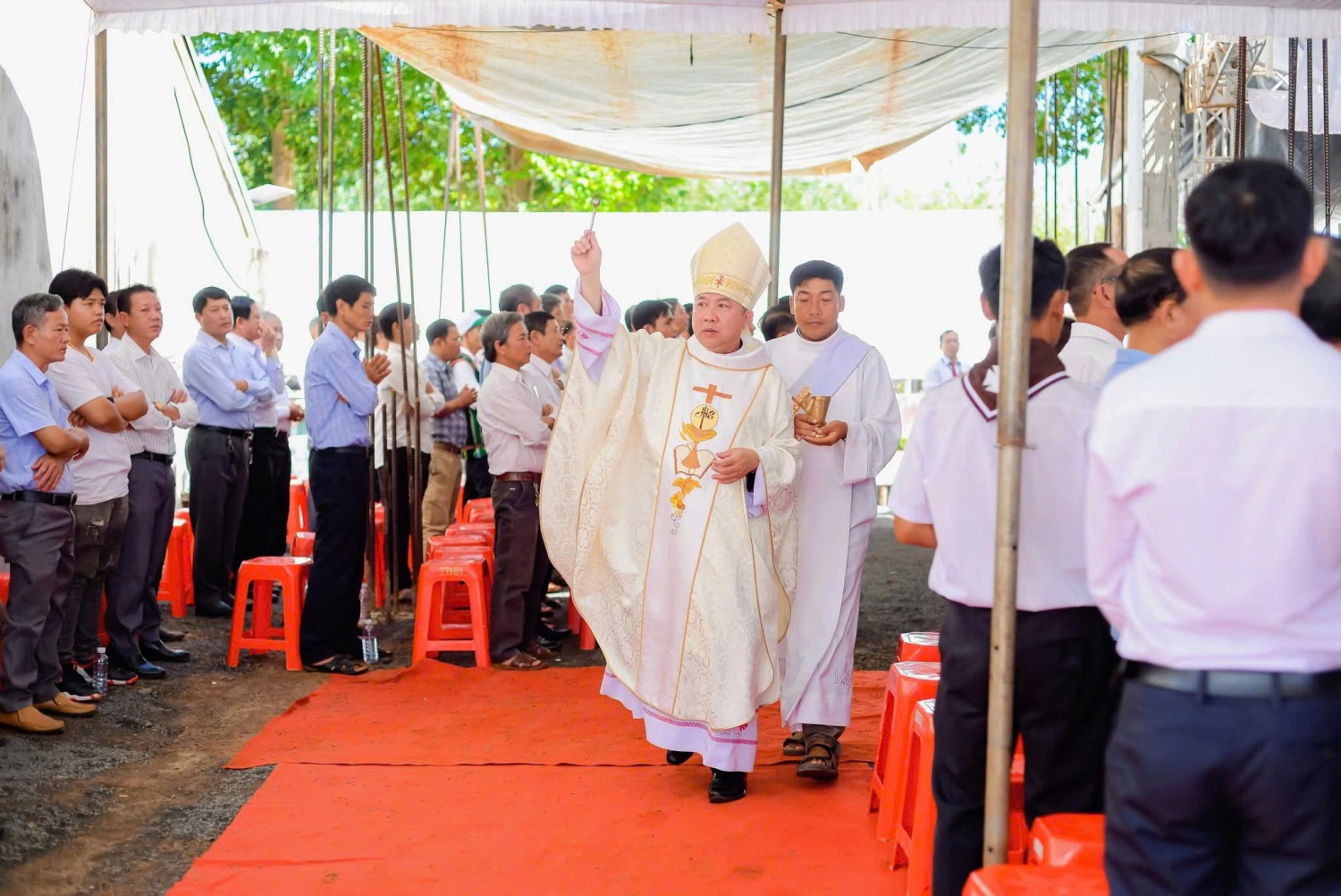 Tiếp đến, Đức Cha cử hành nghi thức làm phép khu đất – đọc lời cầu nguyện, rảy nước thánh và thánh hiến nơi sẽ dựng xây ngôi Thánh đường.