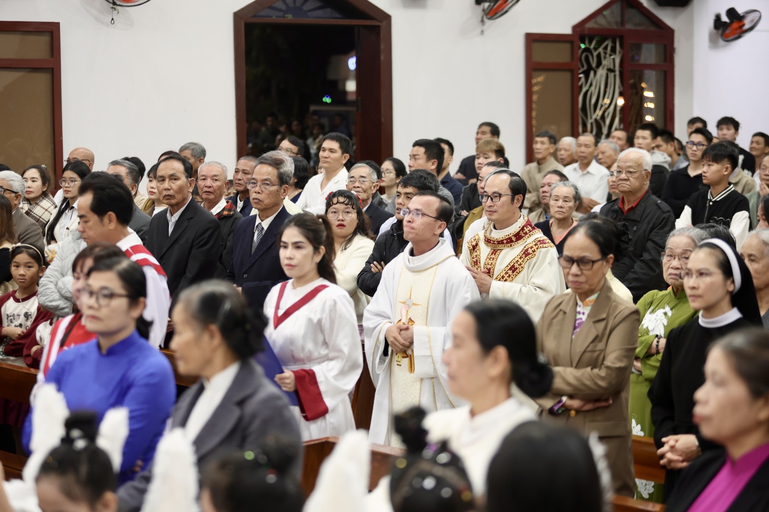 Đỉnh cao của đêm hồng phúc là Thánh lễ Vọng Giáng Sinh do Cha Quản xứ Tôma Aquinô chủ tế, cùng đồng tế có Cha Phó Antôn. Đông đảo giáo dân và anh chị em lương dân hiện diện chật kín thánh đường và khuôn viên nhà thờ, hiệp lòng trong niềm vui và tâm tình tạ ơn.