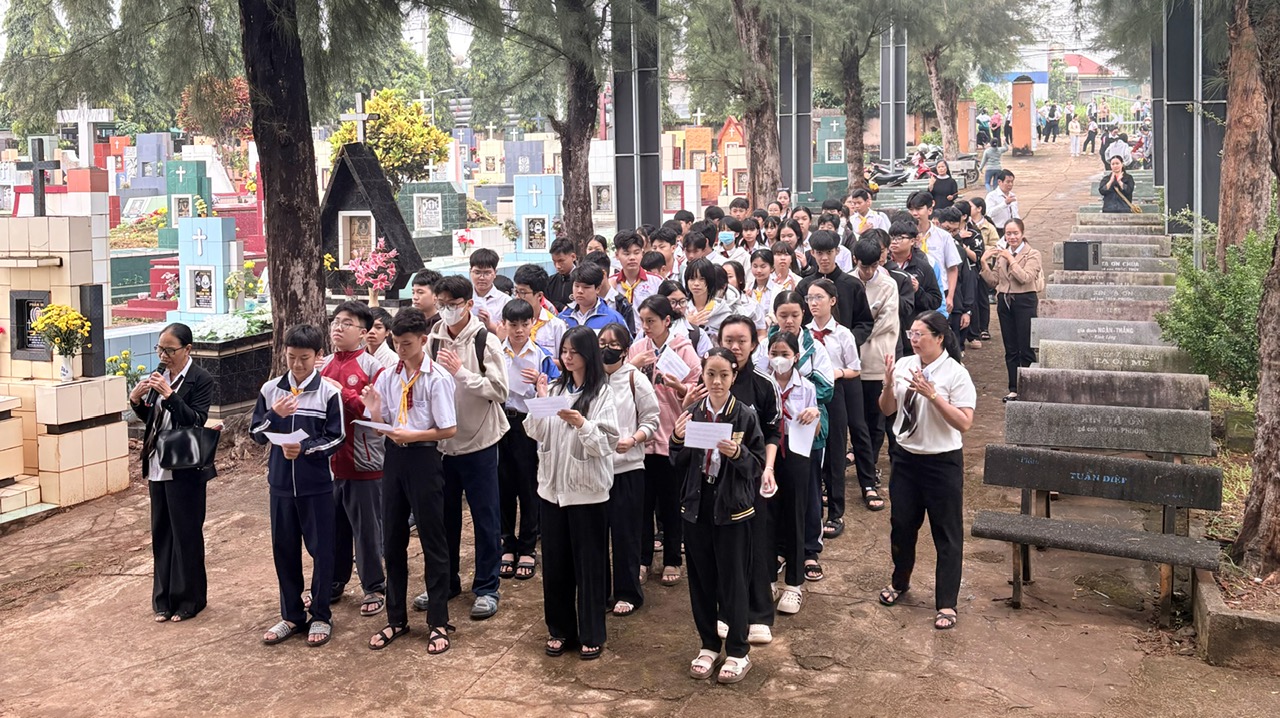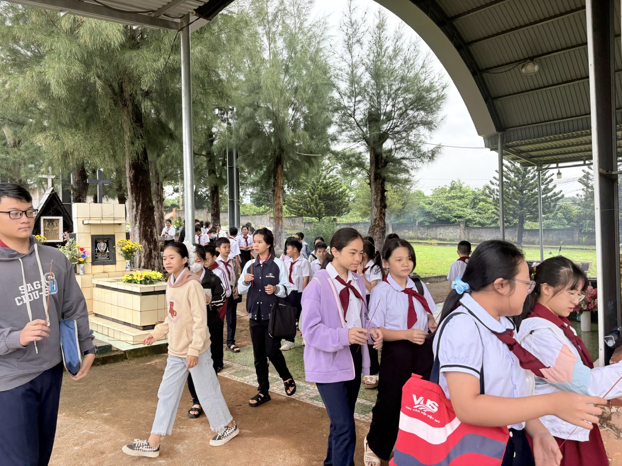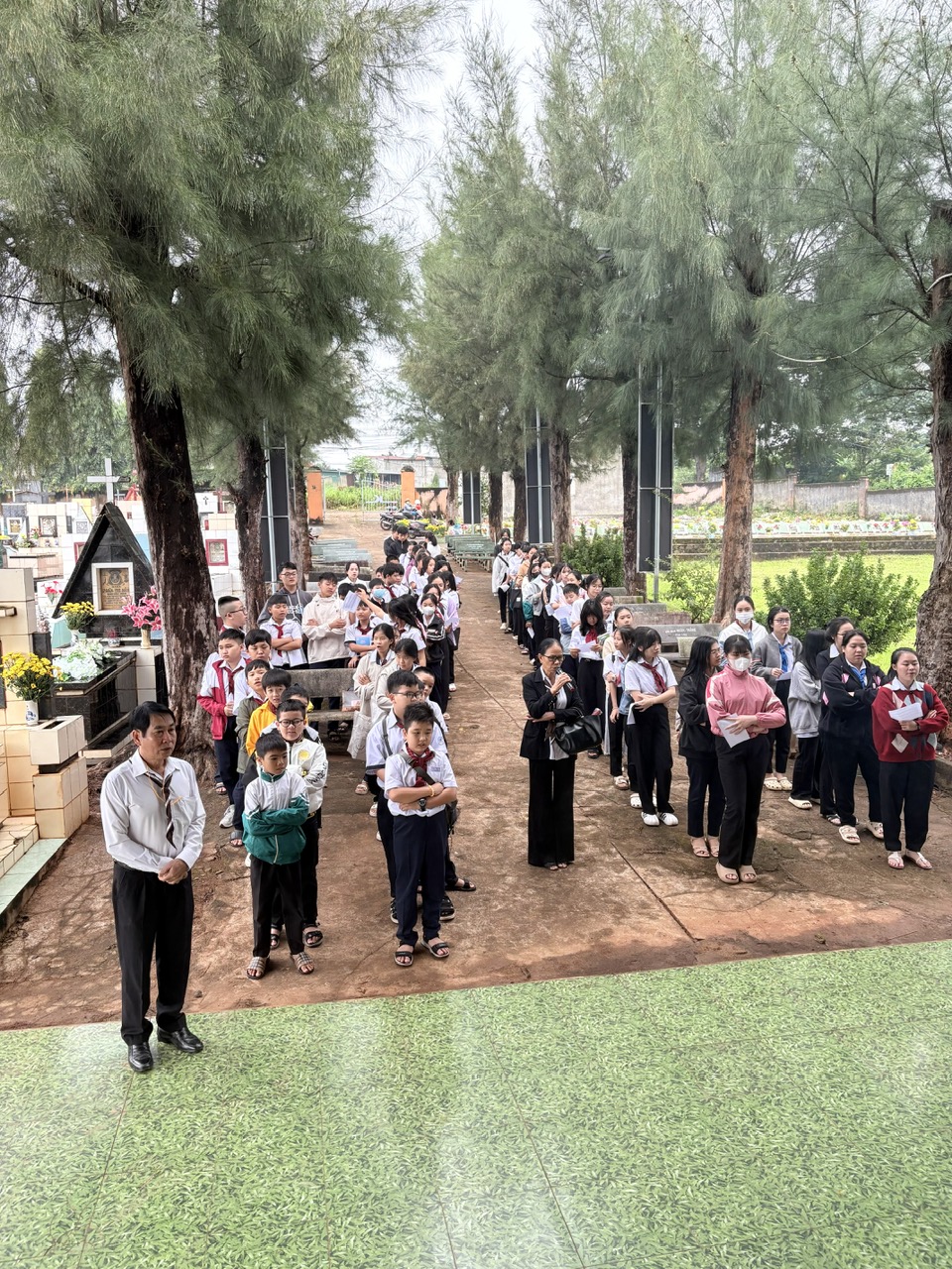 Trong thời gian cầu nguyện, các em đã cùng nhau dâng lên Chúa những lời kinh, lời hát như những bông hoa nhỏ của lòng hiếu thảo và biết ơn, tưởng nhớ các bậc tiền nhân – những người đã góp phần xây dựng và gìn giữ đức tin cho cộng đoàn hôm nay. Sau phần cầu nguyện chung, các em đã dâng hương trên phần mộ của người thân, gửi gắm niềm thương nhớ và lời cầu chúc bình an cho những linh hồn thân yêu.