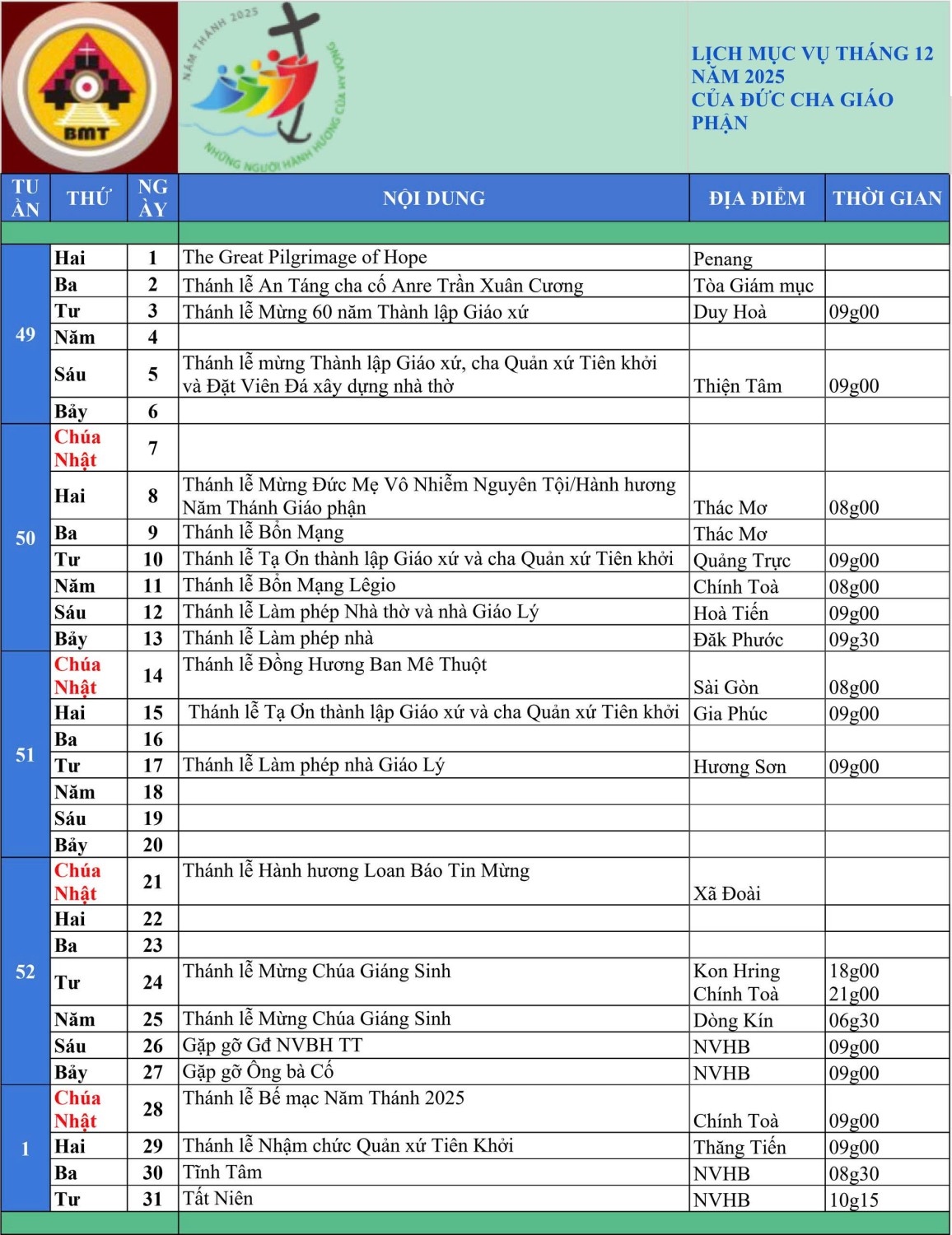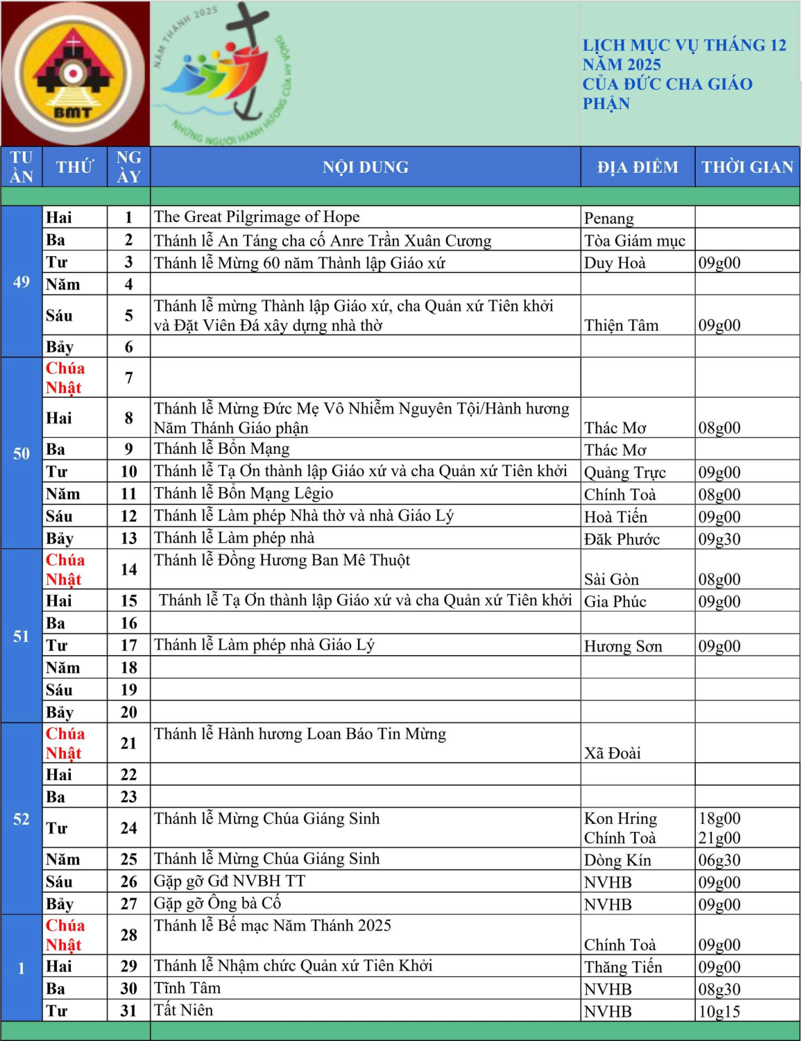 Năm (11/12): Thánh lễ Bổn Mạng Legio – Chính Tòa (08g00)