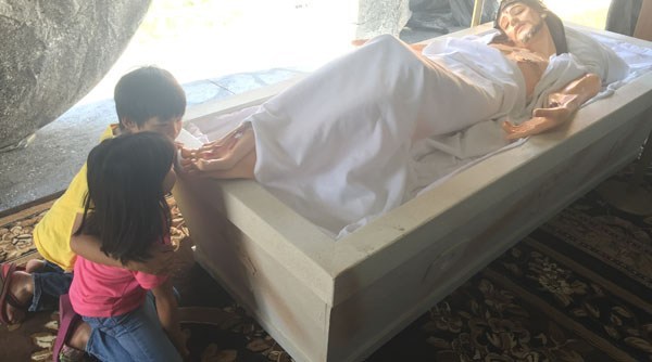 Sau những nghi thức phụng vụ Thứ Sáu Tuần Thánh kết thúc, quê tôi thường có rước tượng Chúa chịu nạn và mai táng Chúa trong mộ. Tượng Chúa to như người thật và được đặt trong quan tài bằng kính, để mọi người có thể thấy rõ các chi tiết hằn lên thân xác đau thương của Ngài. Và đôi chân thò ra để mọi người hôn kính. Điều đặc biệt hấp dẫn bọn trẻ con chúng tôi là chung quanh đôi bàn chân của Chúa có đầy cốm hoặc bỏng ngô. Mỗi lúc đến hôn chân Chúa, bọn tôi chẳng để ý gì đến những đau thương Chúa đã chịu mà chỉ nhớ mỗi lần hôn là hai tay bóc đầy những bỏng ngô và cốm ngọt. Lần này đến lần khác… cho đến khi miệng không còn thích thú nữa.